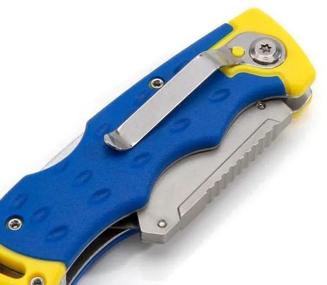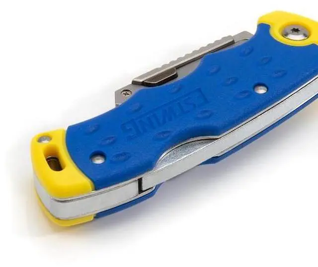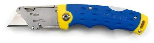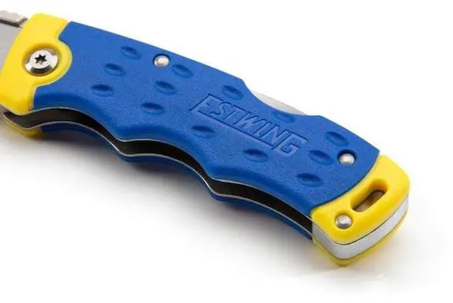 California Proposition 65: This product contains a chemical known to the State of California to cause birth defects or other reproductive harm. Take on a range of cutting tasks and jobs with this convenient and versatile knife. Designed and built for maximum utility, this knife measures 7-inches long when fully opened and uses the same disposable blades as standard retractable box knives. This gives this knife the ultimate in versatility as you can use its quick change design to swap between an old and dulled blade with a fresh, razor sharp one or to an entirely different blade style like hooked or serrated for specialty jobs. A jimped / ridged thumb rest on the back of the zinc-alloy blade holder provides a comfortable way to add extra force for cutting through denser materials. For convenience a single SK-5 hardened carbon steel blade is included to get you started with additional replacement blades available at most hardware stores. The comfortable and ergonomic, Estwing blue and yellow handle is made from high-visibility polypropylene and TPR rubber that is weather resistant. The lock back mechanism on the spine keeps the blade securely open when in use and prevents accidental closure and injury.