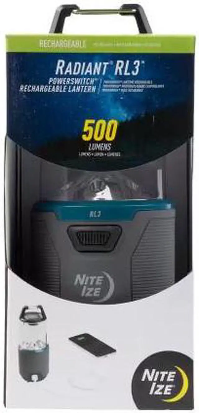 Meet the ultimate wilderness companion, the Radiant RL3 PowerSwitch Rechargeable Lantern. This lantern is equipped with 6-modes to suit any setting: 4 classic white modes that cover the full spectrum of brightness from 5 Lumens to 500 Lumens and 2 ambient amber modes including flicker to mimic a flame. RL3 is there when an outlet is hard to come by, recharging phones and devices in a pinch with its built-in USB output. When the Lithium Ion battery runs low, PowerSwitch saves the day. With 3-AA alkaline batteries (not included) inserted in its reserve battery compartment, the lantern will automatically switch power over to extend runtime, lasting up to 16-days on moonlight mode. Need the light even longer. Pack an extra set of batteries to keep shining. Built for all conditions, this lantern is weatherproof (IPX4), impact-resistant and includes a built-in carabiner clip and lens-protecting storage bag that doubles as a light diffuser. RL3 recharges with its included USB-C cable in 6-hours and features lockout mode to prevent accidental activation.