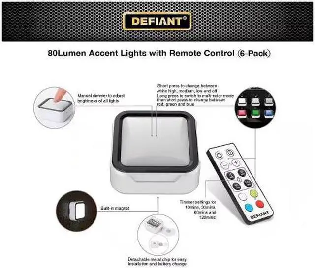 The 40 Lumens LED Puck lights are the perfect solution to easily light and change the mode of any room. Switch lights on and off, or change colors to red, green, blue and white. You can adjust brightness or set a timer with the remote control. Timer Settings, 10-minutes, 30-minutes, 60-minutes or 120-minutes. The lights are battery operated so there is no need for wiring, simply load the batteries. Mounting tape (included) to the back of each light and you can mount anywhere.