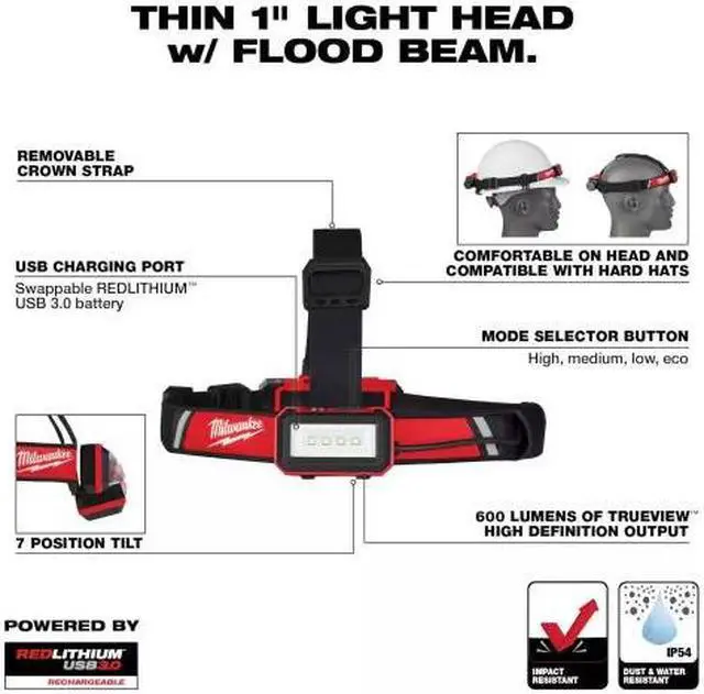 The MILWAUKEE REDLITHIUM USB Low-Profile Headlamp powered by REDLITHIUM USB offers HIGH OUTPUT lighting that stays brighter for longer. This headlamp delivering 600-lumens of TRUEVIEW High Definition Output with a thin 1 in. light head, and 125° of flood beam coverage. Our rechargeable headlamp is designed with the battery pack in the rear for maximum maneuverability in tight spaces and a balanced design for all-day use. The hardhat headlamp is equipped with a sweat absorbing microfiber strap for comfort on bare heads and four included hard hat clips for secure connections on all hardhats.