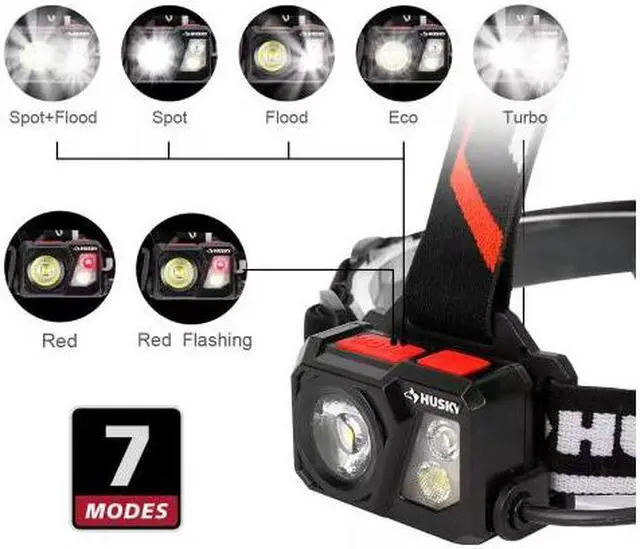 This headlamp features 7-light modes: Turbo/High/Spot/Flood/ECO/Red/Red flashing.