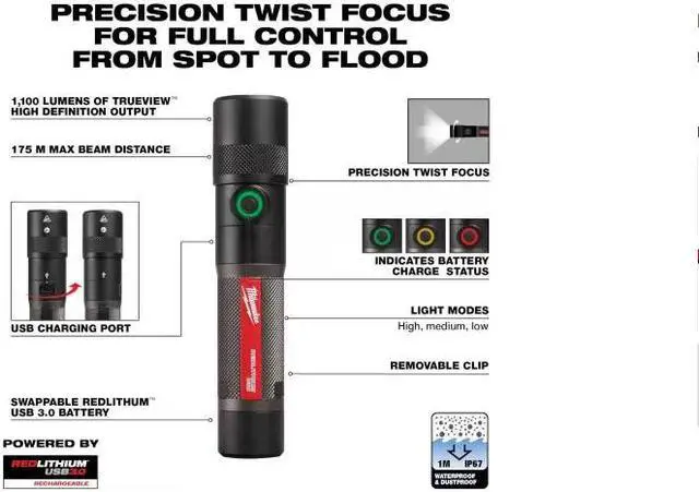 The MILWAUKEE REDLITHIUM USB Rechargeable 1100L Twist Focus Flashlight powered by REDLITHIUM USB offers HIGH OUTPUT lighting that stays brighter for longer. Leveraging advances in LED Technology, this rechargeable flashlight maintains a compact body while delivering 1100L of TRUEVIEW High Definition Output, giving you the ability to see up to 175-meters (574 feet). The flashlight features precision twist focusing for full control of the beam size and intensity allowing you to search, trace, or inspect better. Designed for easy carry and storage, this compact flashlight has a removable clip for versatile attachment.