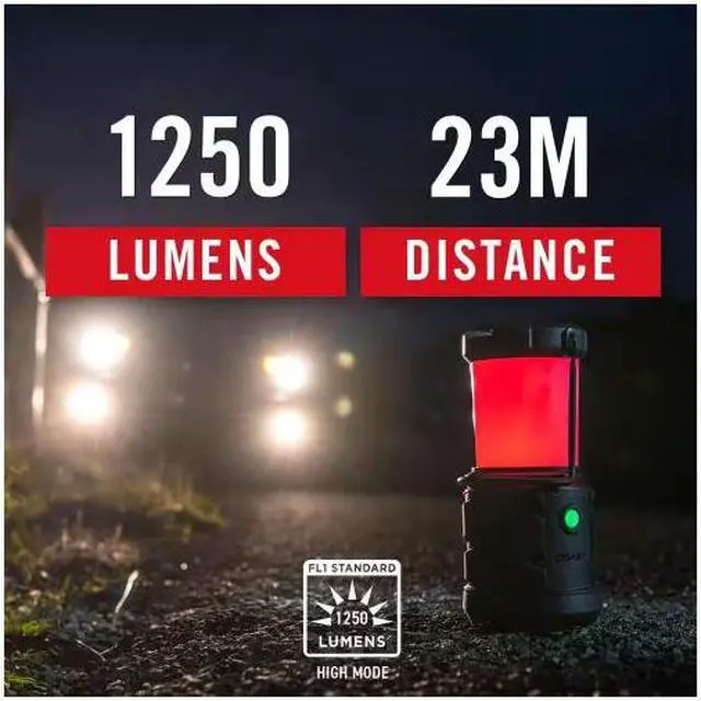 Fill the room, jobsite or outdoors with light. The EAL26 emergency area light upgrades the classic lantern with an array of modern technological features-starting with a Dual Power system that allows the light to operate on 3 D cell alkaline batteries or on a Coast ZITHION-X ZX1010 rechargeable battery (sold separately). Peaking at 1250 Lumens on alkaline power or 2120 Lumens on rechargeable lithium power, the efficient EAL26 boasts a maximum run time of 135-hours and provides 5-light modes: low warm, medium, high, solid red and flashing red. Easily carried by its swinging handle or set up on a table, stump or truck bed, this lantern also features a removable and virtually unbreakable light diffuser that twists off to reveal an even brighter globe light inside. A carabiner on the light's base allows it to be hung upside-down as an overhead light-whether from a wire, a hook or a length of cord. The EAL26 is built to IP54 specifications and, like all Coast lighting products, is backed by a lifetime warranty.