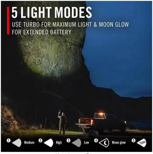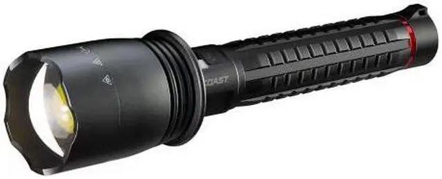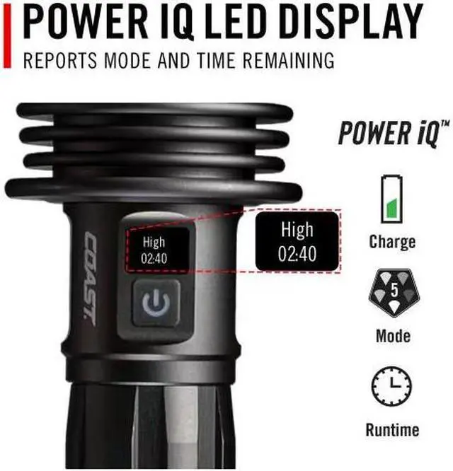 Overcome darkness with overwhelming light. As the highest-output flashlight in the Coast collection, the rechargeable XP86R shines up to 15, 000 Lumens. The Ultra View Adjustable Flood beam focuses with 1-hand-simply push or pull the bezel to change the beam shape, with a maximum length of 767 ft. Select from 5-modes-medium, high, low, MoonGlow and Turbo-to shine as bright as the moment demands. During use, the Smart Display with Beam IQ screen in front of the power switch displays what mode the flashlight is operating in and how much run time remains in the battery.