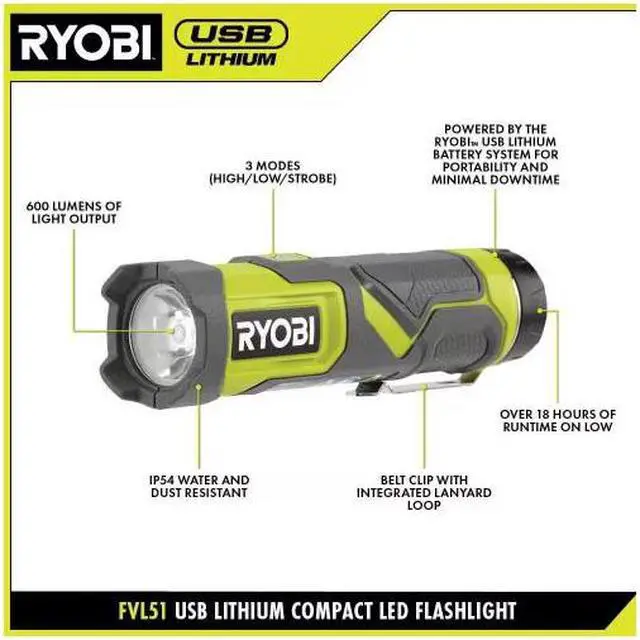 This USB Lithium LED Flashlight kit is backed by the RYOBI 2-Year Manufacturer's Warranty and includes (1) FVL51 Compact LED Flashlight, (1) USB Lithium 2.0 Ah Battery, USB Cable, 2.0 Ah Battery, and Operator's Manual.