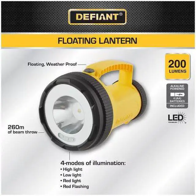 The Defiant 200-Lumens Floating LED Lantern gives you bright light when you need it, whether you're staying inside during a power outage or moving about outdoors. The Lantern floats for easy recovery in water, making this lantern ideal for storing in boats, kayaks, canoes, survival kits and more. Equipped with 200-Lumens of bright LED light, this floating light has 220meters beam distance. Includes 4 AA alkaline batteries to keep this LED camping lantern shining brightly for up to 10-hours or use 8 AA alkaline batteries for 140-hours of reliable light when you need it most.