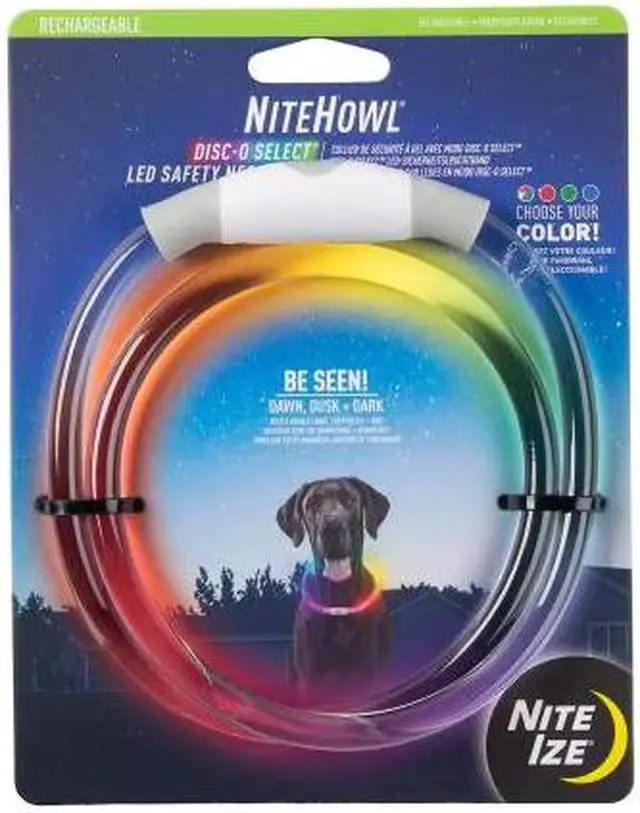 The brilliantly durable and rechargeable NiteHowl LED Safety Necklace by Nite Ize is made with flexible polymer that's illuminated by bright LEDs and can be recharged for hours of nighttime fun and safety. With Disc-O Select, this NiteHowl makes identifying multiple dogs easy with the ability to choose from 1 of 3 selectable colors (red, green, blue), plus a unique Disc-O mode that you'll have to see to believe. By illuminating the polymer with multiple colors at the same time, Disc-O mode creates a flowing color-blending pattern that's as fun as it is functional.