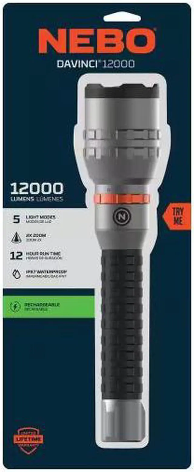 The DAVINCI 12000 flashlight - a powerhouse of illumination in a compact, rechargeable design. This waterproof (IP67) flashlight boasts an impressive 12, 000 lumens in turbo mode, providing unparalleled brightness for any situation. With 5 light modes and 2x zoom, the DAVINCI 12000 offers versatility and precision in its lighting capabilities.