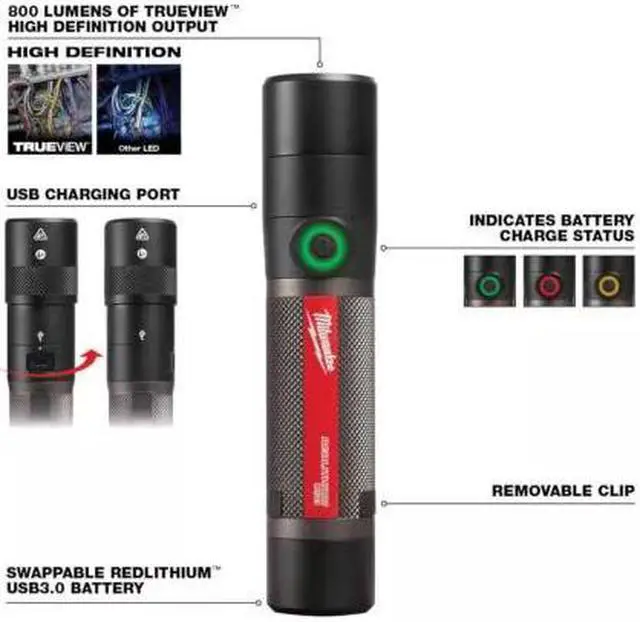 The MILWAUKEE USB Rechargeable 800L Compact Flashlight is pocket portable with uncompromised power. Leveraging advances in LED Technology, this flashlight maintains a pocket portable body while delivering 800L of TRUEVIEW High Definition output that gives users the ability to see up to 150-meters (492 feet). The bulls-eye beam is designed to combine the accuracy and intensity of spotlighting with the widespread coverage of floodlighting, giving the user the ability to search, trace, or inspect better. This compact flashlight with a removable clip is designed for easy carry and storage, making it an ideal solution to keep in users' pockets and tool bags.