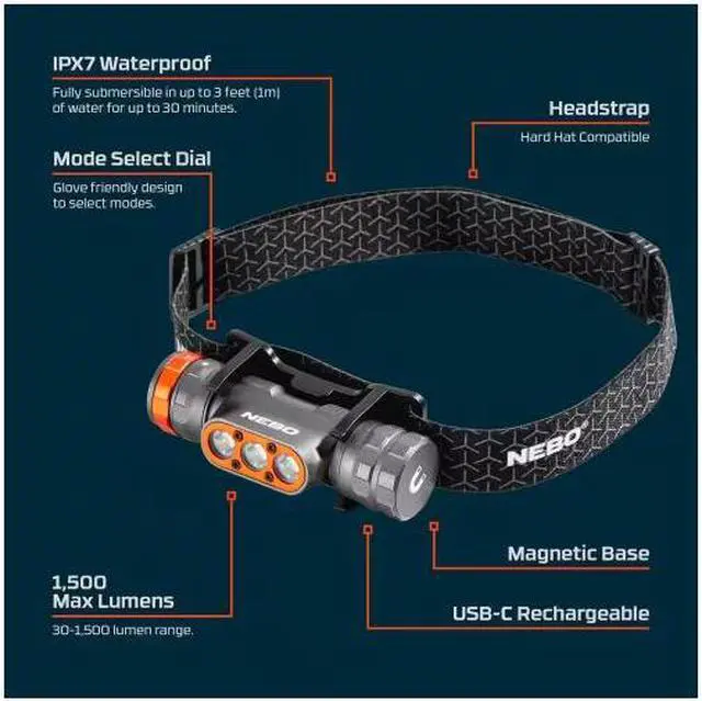 Versatile Light Modes: *Turbo (1, 500 Lumens) - 30-second intervals/129 metersHigh (750 Lumens) - 4 hours/91 metersMedium (300 Lumens) - 5.5 hours/58 metersLow (30 Lumens) - 28 hours/18 metersStrobe (750 Lumens) - 4 hours/91 metersWhether you're exploring the wilderness, working on tasks in low-light conditions, or preparing for emergencies, the TRANSCEND 1500 headlamp is your reliable companion. Experience the beauty of the great outdoors with clarity and confidence, courtesy of NEBO's TRANSCEND 1500. *Automatic return to the previous mode after 30 seconds to prevent overheating.
