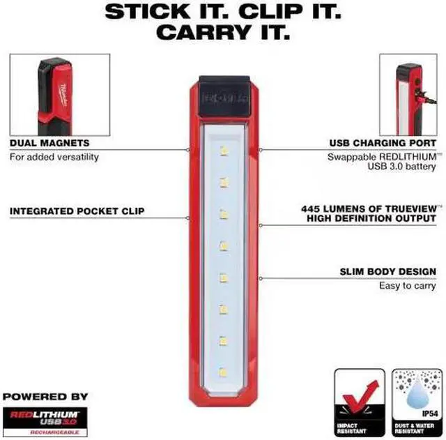 The MILWAUKEE REDLITHIUM USB ROVER Pocket Flood Light is powered by REDLITHIUM USB and allows users to stick it, wear it, and carry it anywhere. This small floodlight delivers users 445 lumens of TRUEVIEW High Definition Output and is capable of all-day runtime, more recharges, and 3X faster charging via USB. Users can stick, clip, and carry it anywhere with its dual magnet clip, perfect for mechanical, electrical, H/VAC-R, MRO, and automotive trades. The USB rechargeable light is impact and chemical resistant to withstand harsh environments.