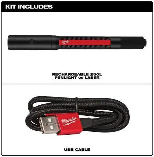 The Milwaukee Rechargeable 250L Penlight with Laser offers users faster, more accurate inspections. This rechargeable penlight delivers 250 lumens of TRUEVIEW HIGH DEFINITION OUTPUT, and an integrated laser pointer ensures faster inspections and accurate communication on the jobsite. A built-in protective rubber bite zone allows users to quickly direct light while performing two-handed tasks. With two output modes, users get the optimal light or run-time up-to 8 hours for any task. Stay ready from job-to-job with USB charging and an on-board battery indicator. The removable metal clip offers a secure attachment to shirts or pant pockets for reliable storage.