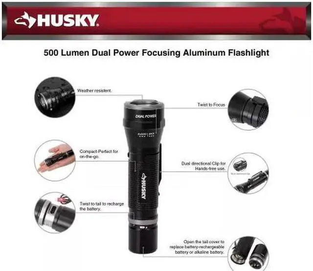 The 3.7 -Volt 1200 MAH Rechargeable Replacement Battery is for the Husky 500 Lumens Dual Power Aluminum Flashlight(SKU# 1010865352). Do not allow the battery to completely discharge. A dim light or power indicator flash red indicates low battery. Turn off the flashlight and recharge the battery as soon as possible.