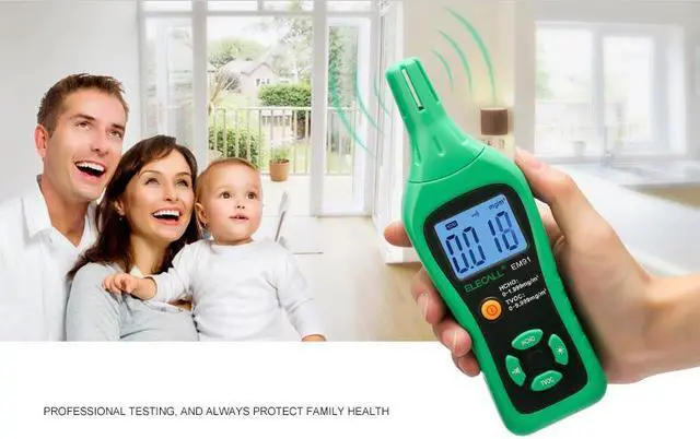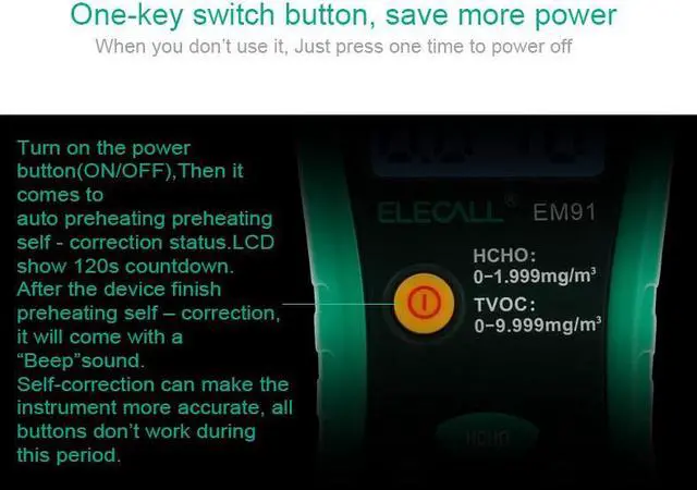 ELECALL EM91 Digital Smart Formaldehyde Gas Detector Gas Meter Formaldehyde Tester Sensor HCHO TVOC Meter Air Analyzers Brand:ELECALL Model NO.:EM91 Product Name: Air Detector Gas Analyzer Detector subject: formaldehyde 0.001mg/m3; TVOC 0.001mg/m3; Detection principle: semiconductor gas sensor Detect range: formaldehyde(HCHO)0.000~1.999mg/m3; TVOC 0.000~9.999mg/3; Battery:1.5V AAA*4 (not included) Working temperature:-10~45C Working Humidity:10~75%RH Storage temperature:-10~60C Storage Humidity:10~70%RH Weight:128g Package include:1*gas detector,1* user manual