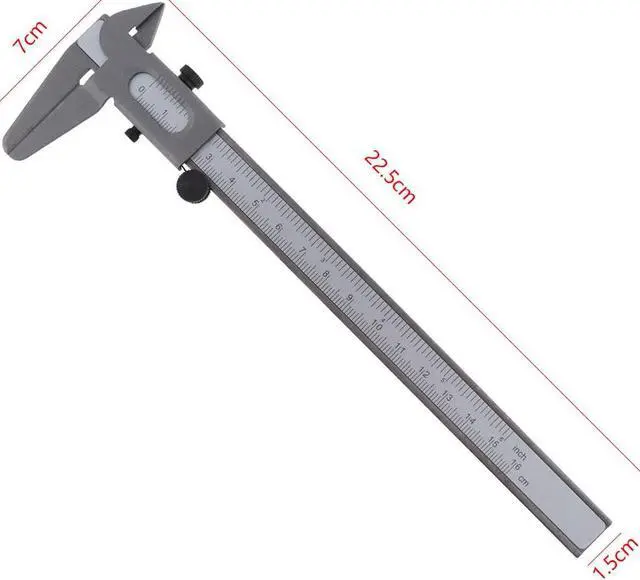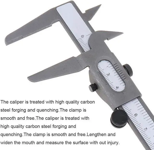 160mm Mini Carbon Steel Vernier Caliper Ruler with 0.1mm / 0.063in Accuracy and Sliding Wheel for Measuring Product Type:160mm Carbon Steel Vernier CaliperRuler Length: 224mmRuler Width: 15mmMaterial: Carbon SteelColor: SilverQuantity:1Accuracy: 0.1mm / 0.063inMeasurement Range: 0-160mmFeatures: - Vernier caliper is a measuring tool for measuring length, inner and outer diameter, and depth. - It is composed of a main ruler and a cursor that can be slid on the main ruler. - High-quality carbon steel forged surface polished beautifully rust-proof, clear scale, millimeter precision and not easy to wear, easy to operate and easy to use. Package Weight : 111.0 G / 3.92 Ounces Package Dimensions (L*W*H) : 268*86*10 MM / 10.55*3.39*0.39 Inches Retail Packaging: Yes, Blister Packaging