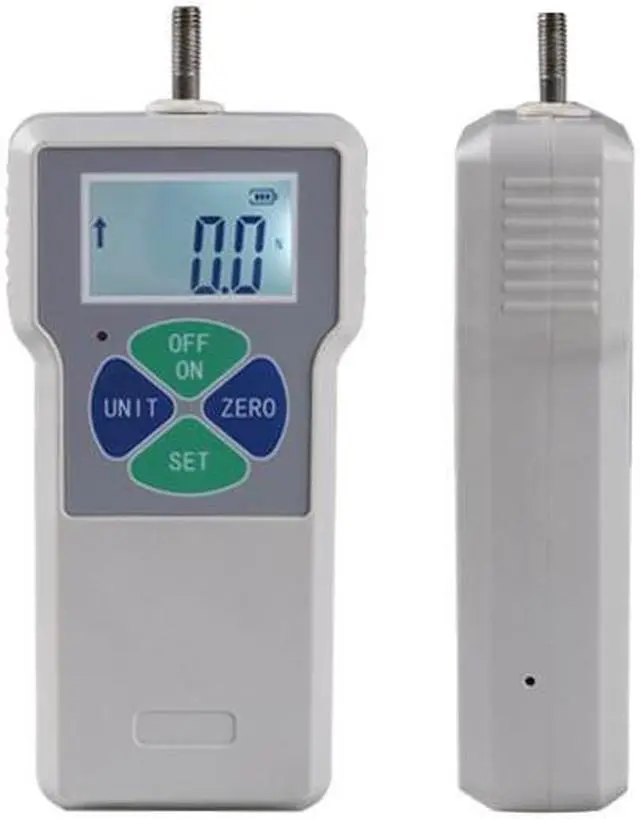 The key introduction OFF/ON(start up ,shut down key):when press this key,turn on the power,appear measuring interface.Press this key again can shut down gauge.ZERO(zero key)The testing value on the screen can be zero when click this key. UNIT( switch unit key)It can switch three different unit s when click this key. This product is a simple push pull force gauge with high performance.1.Digital display,easy reading;2.In light weight,small size,easy to carry;3.Unit display:Lb,Kg,N4.The battery has over-load protection in case of short circuit and leakage of electricity .It also can tell you when the battery is running low.It adopt the 3.7V lithium battery and auto shut off with no operation in 10 minutes at the same time. Screen display1.Peak mode: After turn on,enter into the measuring interface,click SET button can enter into the peak mode directly,record the Max. force value during measuring.2.Push pull force shows:do not move the gauge,the above arrow shows the pull force,the below arrow shows the push force.3.Measuring force value display.4.Three units:N(newton),kg(kilogram),lb(pound) display respectively ,press UNIT button to switch .5.Power display.