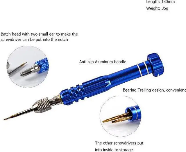ELECALL 6 In 1 Screwdriver Sets Multi-function Repair Tools Digital Computer Mobile Phone Repair Torx Phillips Slotted 6 in 1 Screwdriver set with T6 T5 Torx0.8 Phillips1.2 Slotted2.0 Magnetic: The screwdriver head with magnetic Material: High hardness S2 Specification: T6 T5 Torx0.8 Phillips1.2 Slotted2.0 Notice: As the other four screwdriver was hide in the cover, you just need to open the cover and can see it.