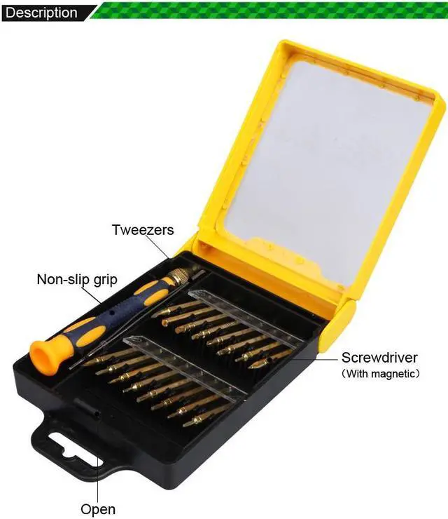 Material:CR-V, S2 Package Size:103*135*35mm Weight:229g Magnetic:With magnetic Color: Gold/Silver (random) Design professional and practical, beautiful appearance, for a wide range. High precision batch of mouth material specially heat treatment; full boxed. According ergonomic hand grip designed to make the operation more comfortable. Complete specifications of high-quality precision screwdriver, can be adapted to a variety of jobs in different fields.