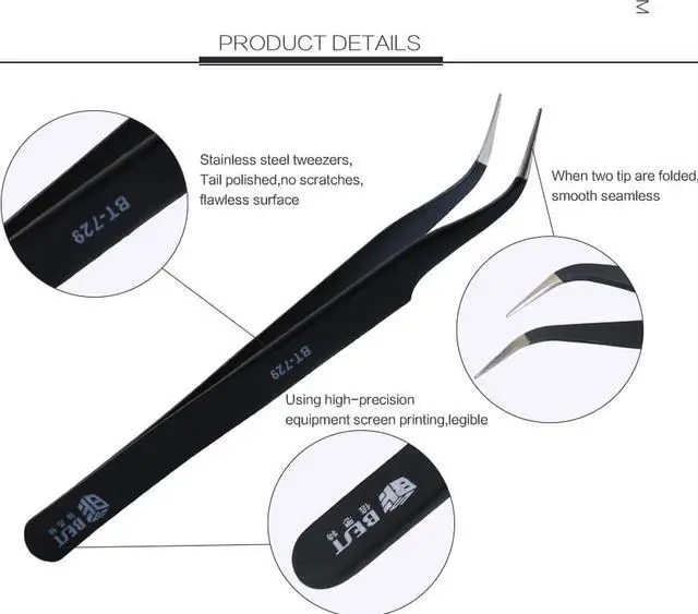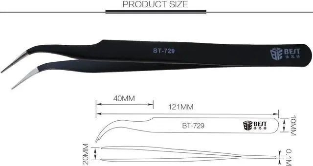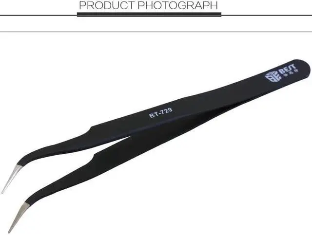 BST-729 Eyelash Tweezers Anti-static DIY Hand Clip 121MM Tweezers Made by the stainless steel Anti-corrosion and anti-acid Cutting-edge parts of pure manual polishing,fine workmanship Processed in high temperature and planting anti-static material Easy to carry and use