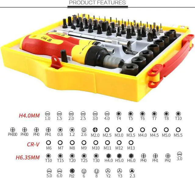 BST-2028B 64PCS Dual-Drive Multi-Purpose Screwdriver Set Mobile Phone iPad Camera Industrial Repair Tools 1. Doul-driver ratchet handle,easy to operate 2. Practical PP material handle, environmental design, comfortable to hold 3. Zinc alloy ratchet, Cr-v steel bits, durable and longer life 4. 59pcs different bits, include philips, torx,slotted, Hex,pentalobe,socket head, can be used for cell phone, laptop,PC, car, bicycle repairing. It is a perfect handle tools for a DIY and family man.