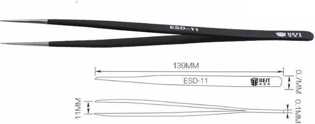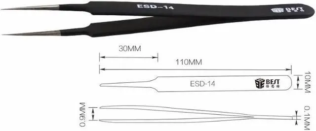 Category:ESD Tweezer Model:BST-12,ESD-13,ESD-15 Material:302 Stainless steel Magnetism:Non Surface treatment:anti-static coated Tip strength:>HRC40 Length:135mm/115mm/118mm Weight:30g(With package) Made by the high quality stainless steel Anti-corrosion and anti-acid Cutting-edge parts of pure manual polishing,fine workmanship Processed in high temperature and planting anti-static material Tips after a long time use is still super straight