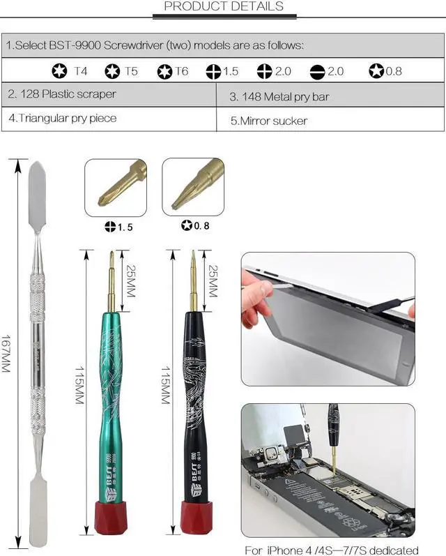 BST-599A:T6,T5 BST-599B:Pentalobe 0.8,+1.5 BST-599CT4,+1.5 BST-599D+2.0,-2.0 BST-599ET6,+1.5 BST-599F+1.5,-2.0 Professional screwdrivers allow you to open cover of mobile phones easily and without damage to the phone cover. Great tool set for collecting or everyday use,compact design and lightweight. Compatible with: iPhone Samsung Nokia HTC Moto Sony Universal. Aluminum screwdriver handle with S2 screw bits.
