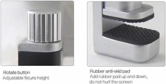 Material: Plastic,rubber Net Weight: 42 g Holder width: max 15m Note:Please spin the top gently or you maybe break the display screen. There are scratches on the surface,it does not affect function.Please make sure you do not care,thanks Universal clip fixture Adjustable holder to fit most mobile phone and tablets Used to clamp your repaired device Help the replaced new screen in its right place,not bulge or sink Make the screen to joint with the frame perfectly Inside rubber pad will never scratch the screen