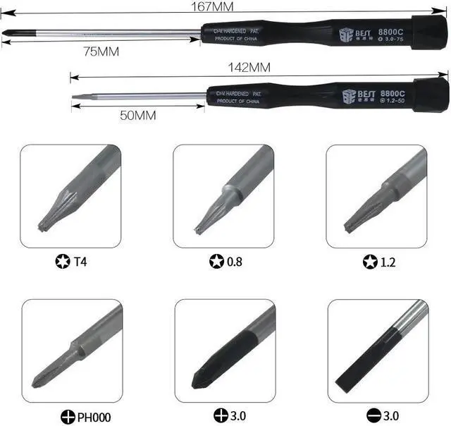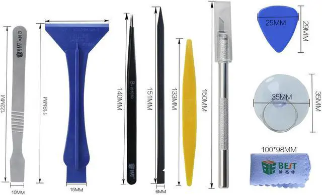 ESD Tweezers:Anti-static Material of Screwdriver:Cr-V steel Material of Pry plate:High Quality Plastic Handle of Burin:Aluminum Alloy Weight: 341.5gSize: 243x140x30mm Professional repair kit for all kind of cell phone and electronic device.Such as,mobile phone-iPhone/Samsung/LG smartphones,PC/computer/ laptop/ desktop/ Macbook/ Tablet/ iPad,SLR cameras,Xbox and other electronic devices Precision Screwdriver made of chrome vanadium steels head,include Pentalobe 0.8 and 1.5/T3/PH000/+3.0/-3.0 High quality toughness Pry plates,won't broken easily.Helping you to disassemble your phone without damage to the tablet or phone cover Anti-static tweezers,matte black surface finish provides excellent non-slip handling.Precision machined for exact alignment and a perfect grip at the tips All of tools package in a bag,easy to store at home.Repair set configuration is complete, comprehensive and strong,perfect for your repairing work.