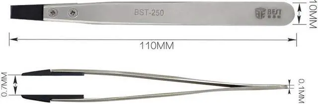 ESD Plastic Replaceable Tip 1. Material: PPS plastic 2. Anti-corrosion and anti-acid 3. short-term resistant to 260 C 4. can be in 200 ~ 240 C long-term use 5. PPS resistance to the radioactive. 6. plastic tweezers are fully non-magnetic. Category:Stainless steel(with interchangeable tip )Tweezer Model:BST-250 Material:Stainless steel handle+PPS ESD plastic head Magnetism:Non Surface treatment:Matt finish treatment Strength>HRC40(handle),high strength plastic (head) Length:115.5mm Weight:24.5g(with package) Packing:17pcs Weight/box:500g Size of box:204*163*45mm(L*W*H) Size of carton:52*42*34cm(L*W*H) Weight of carton:16kg Head adopts ESD PPS plastic Surface resistance 1 10 , impact strength: 47j / m Side polished handle, feel comfortable, easy to use Suitable for PCB semiconductor, microelectronics, medical,beaty industry It is also bearable for acid, alkali and high temperature environment. Stainless steel handle acid-proof, the anticorrosion, is not rusty surface using very good special plating processing, smooth, use very comfortable