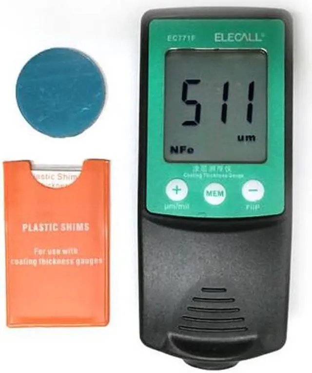Product SpecificationModel: EC771FResolution:1um/0.1milsRange: 0-1250um /0-50milsAccuracy: (3%+2um) / (3%+0.1mils)Mini Curvature: Convex: 5mm; Concave 25mmProduct weight: 68gPower: AAA 1.5V Battery*1Operating temperature: 0C-50CProduct Size: 110mm45mm30mmProduct DetailsPackage: User's Manual, Ferromagnetic substrate, Plastic Shims *4, Carrying Case, Giftbox.Noticed: Battery is not included. Fe type is capable of measuring the thickness of non-magnetic coating ( e.g. paint, procelain, plastic, rubber, or electroplated coating) on magnetic materials (e.g. iron and steel). This unit is ideal for manufacturing company, metal machinery industry, chemical industry, and commodity inspection especially in automobile trading. Auto power off mode designed to conserve battery life, and with lower power alarm Compact design and easy to carry Zero, Multi-point calibration Digital LCD display with FLIP functio