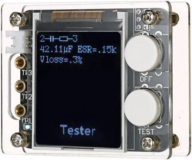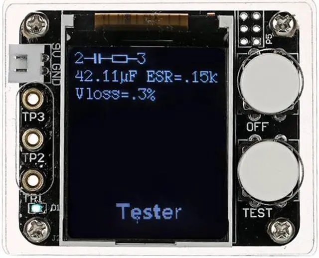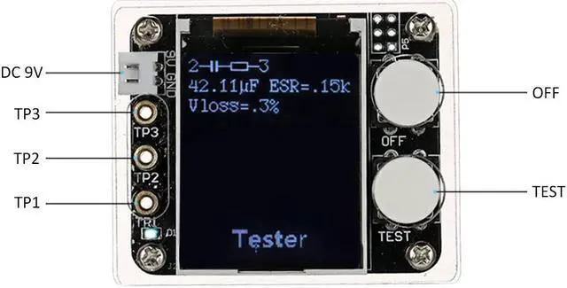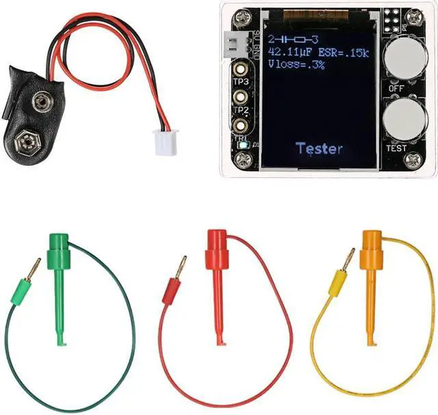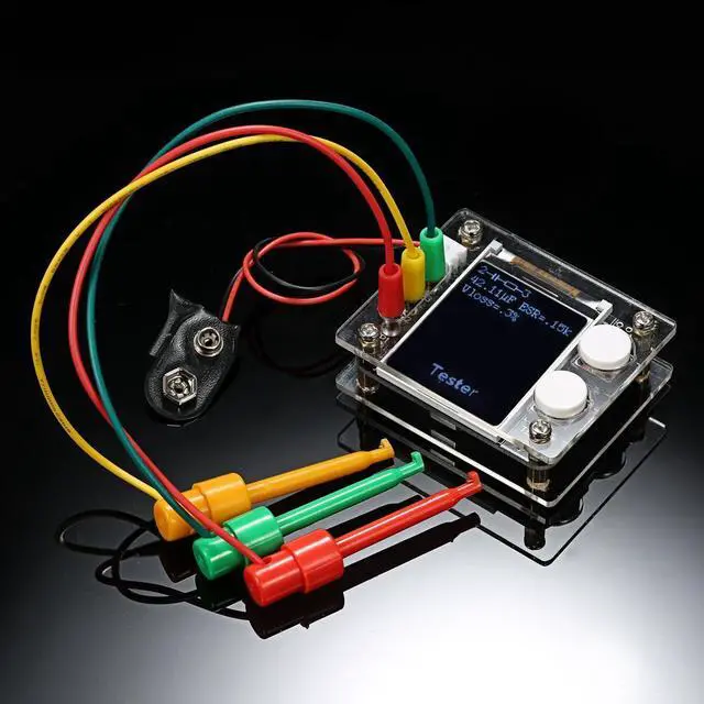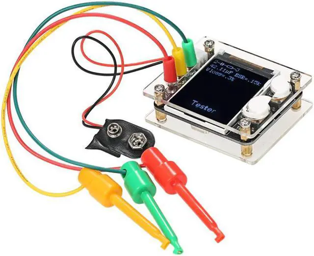 Specifications:Color: MulticolorMaterial: PCB + FR-4 Epoxy BoardType: Assembled Finished Product Display: 1.8" TFT Color LCD DisplayResolution: 128X160Model: GeekTeches MK328Power Supply: 1 * 9V Battery(Not Included)Current: Approx. 30mAResistance Measurement: Max. 50MResistance Resolution: 0.01Capacitance Measuring Range: 25pF~100mFInductance Measuring Range: 0.01mH~20HCapacitance Resolution: 1pFFrequency Range: 1Hz~2MHzDC Voltage Measurement: Up to 50VTest Ranges: Inductors, Capacitors, Diodes, Dual Diode, Mos, Transistor, SCR, Regulator, LED Rube, ESR, Resistance, Adjustable PotentiometerP4: 2.54-2PIN White Seat, for Input 7~12V DC VoltageOFF: ON/OFF Switch, Reset Button (S1)TEST: Test Adjustment, Operation Button (S2) for One-button Operation of the Entire Circuit BoardProduct Size: 61 * 52 * 22mm / 2.40 * 2.05 * 0.87inScreen Size: 35 * 38mm / 1.38 * 1.50inProduct Weight: 38g / 1.34ozPackage Size: Approx. 13 * 8 * 4cm / 5.12 * 3.15 * 1.57inPackage Weight: 50g / 1.78oz Features:Digital 1.8" TFT LCD display for easy readings, can display measured data and graphics.Use 9V battery(not included) for power supply and Single-button operation with automatic shutdown for reducing power consumption.Automatic detection of NPN, PNP bipolar transistor, N-channel, P-channel MOSFET and JFET, diode, dual diode, P-IGPT, thyristor, double thyristor and so on. Support for bipolar transistor current amplification factor and base-emitter turn-on voltage test.Through the turn-on voltage and current amplification factor, you can determine the Darlington triode.Can test the gate threshold voltage of the MOSFET, the gate capacitance, and the drain-source on-resistance RDSon at 5V gate voltage.Support simultaneous measurement of two resistors, data in four decimal format display.Support simultaneous measurement of two diodes, additional display diode voltage drop.Resistance measurement maximum resolution 0.01, can be measured up to 50M.Capacitor can be measured with 25pf~100mF capacitance range and 1pF resolution.Automatically test the pins of a component and show on the display.For the following 2100 resistor while measuring its inductance measuring range from 0.01mH~20H.Can be used as signal generator and frequency meter: frequency range from 1Hz~2MHz.Notice: 1. Before measuring capacitance, the capacitor must be discharged, otherwise very likely damage the meter.2. When testing the components soldered on the circuit board, be sure to disconnect the power supply on the circuit board and leave no residual voltage on the test equipment.