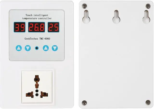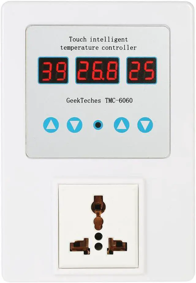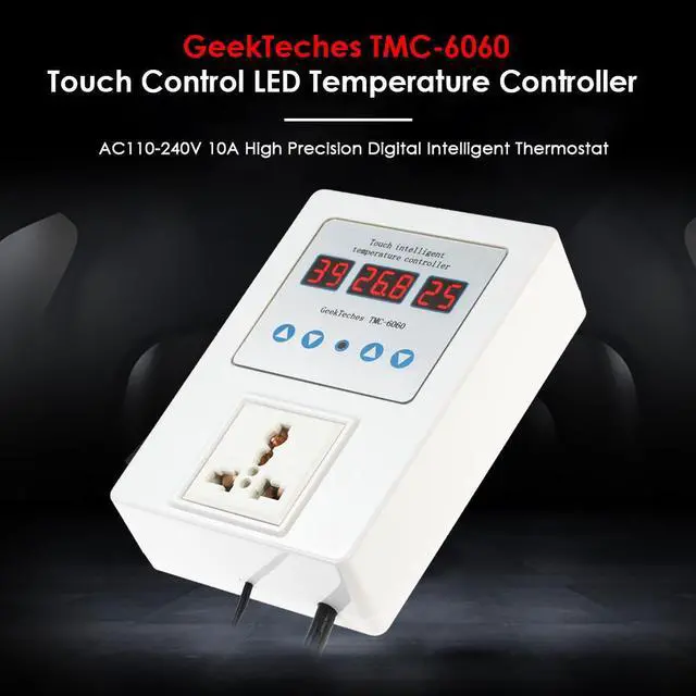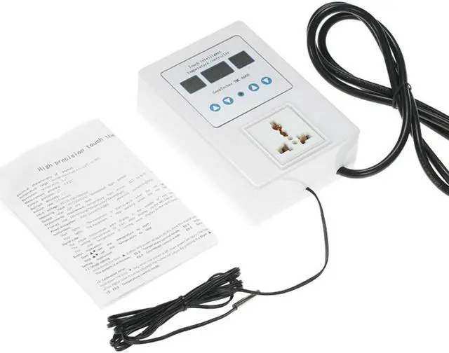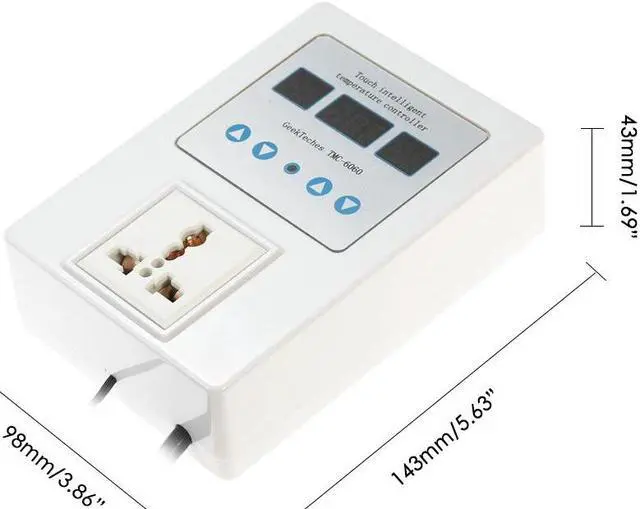 Specifications:Brand Name: GeekTechesPower Supply: AC 110V-240VColor: WhiteMaterial: ABSProbe Model: NTC 10K 0.5% Waterproof Probe Display: LED Digital Tube Triple DisplayTemperature Control Range:-9~99 / 15.8~210.2Temperature Accuracy:0.1 Resolution: 0.1Precision of Temperature Control: 1Return Difference Accuracy: 1 Refresh Rate: 0.5 secondControl: Touch ControlOutput: Relay 10A One LoadWorking Temperature: -10~60(14~140), humidity from 20% to 85% Power Dissipation: static current40mA, dynamic current65mAWorking Modes: Heating or Cooling Mode Power Cable Length: Approx. 150cm / 59inItem Size: 143 * 98 * 43mm / 5.63 * 3.86 * 1.69inItem Weight: 336g / 11.86ozPackage Size: 20.5 * 14 * 7.2cm / 8.07 * 5.51 * 2.83inPackage Weight: 431g / 15.21oz This professional temperature controller features pre-wired cord with a plug to install in your electrical socket, a output socket to plug your appliance and the LED display shows current temperature and start/stop temperature. This device is very easy to set up and adjust, switch to heating or cooling mode freely. It is very accurate in keeping the temperature at the desired level. Plug and play design, easy to use. It is suitable for freezer, conditioner, greenhouse, dog house, incubators, etc.Features:Display the current temperature, start temperature and stop temperature at the same time.4 touch buttons for easy operation to control temperature intelligently.With large and clear LED triple display for better readability.Pre-wired cord with a plug, plug and play design for convenient use.Heating/refrigeration modes, you can set the start/stop temperature freely.3 Control mode of intermittent time, countdown time and appointment time.Wide temperature measuring range -9~99 (15.8~210.2), resolution: 0.1. Support brown-out storage(Set parameters is still valid after short circuit).Also with temperature calibration and delay protection function.Indicator light for indicating working status.Suitable for a wide range of applications, such as fish tank, floor heating, greenhouse, etc.