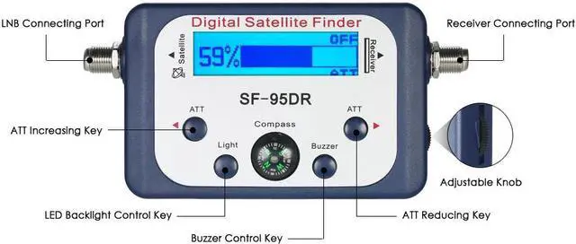 Features: Mini size and light weight, really portable. Designed with a compass for easier and quicker tuning. LCD graphic display with LED backlit to show the satellite signal intensity. Connect to your LNB and receiver to the satellite finder to track the clearest setting for the satellite you wish to tune to. No external power or batteries required, power supplied from your satellite receiver. With buzzer and attenuation control function, easy user-friendly operation.
