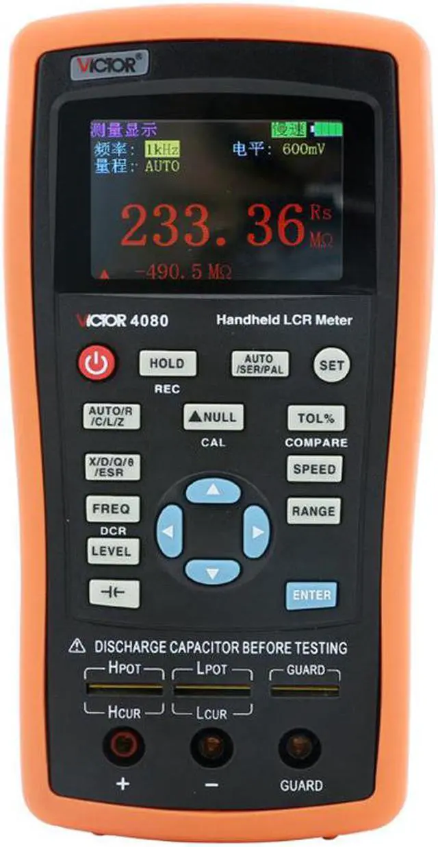 Feature: Technical indicators Display 2.8-inch TFT LCD screen Displays the number of digits The main parameters: 5 Secondary parameter: 5 bits Measurement parameters The main parameters: L / C / R / Z Secondary parameter: X / D / Q / ESR Measuring range (L) 0-2000H Measuring range (C) 0-20mF Measuring range (R) 0-20M Measurement speed 1 time / second (slow seconds), 2 times / second (medium speed), 4 times / second (fast) Correction function Open-circuit correction, short-circuit correction Screening function Screening limit range can be set 1% -50%, where the fixed point of 1%, 5%, 10%, 20% The deviation measurement is used to compare the percentage deviation between the nominal value of the set element and the set value Other adjustment backlight brightness, USB Device, automatic shutdown time can be set Package includes: 1 * VC4080 Digital LCR Multimeter