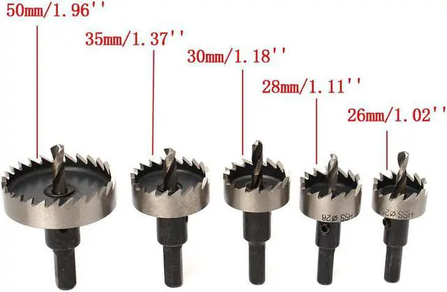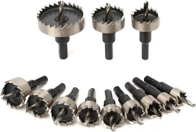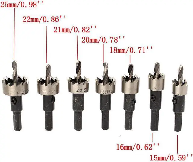 12pcs 15-50mm HSS Hole Saw Cutter HSS Drill Bits Set Features: - Durable and practical. - Provide 12kinds of SIZE H.S.S hole saw, Meet your different needs. - Perfect for installing locks, Knobs in doors and cabinets or drilling larger diameter holes through desks etc. - Cuts steel, Stainless steel, Copper, Brass, Aluminum, Fiberglass, Formica and other laminates in seconds.Material: H.S.SOutside Diameter: - 15mm/0.59in - 16mm/0.62in - 18mm/0.71in - 20mm/0.78in - 21mm/0.82in - 22mm/0.86in - 25mm/0.98in - 26mm/1.02in - 28mm/1.11in - 30mm/1.18in - 35mm/1.37in - 50mm/1.96inLength: 65mm / 2.55in(Approx)Optimal Rotational Speed: 280~300r / min Package Weight : 883 G / 31.15 Ounces Package Dimensions (L*W*H) : 80*100*70 MM / 3.15*3.94*2.76 Inches Retail Packaging: Yes, General Box