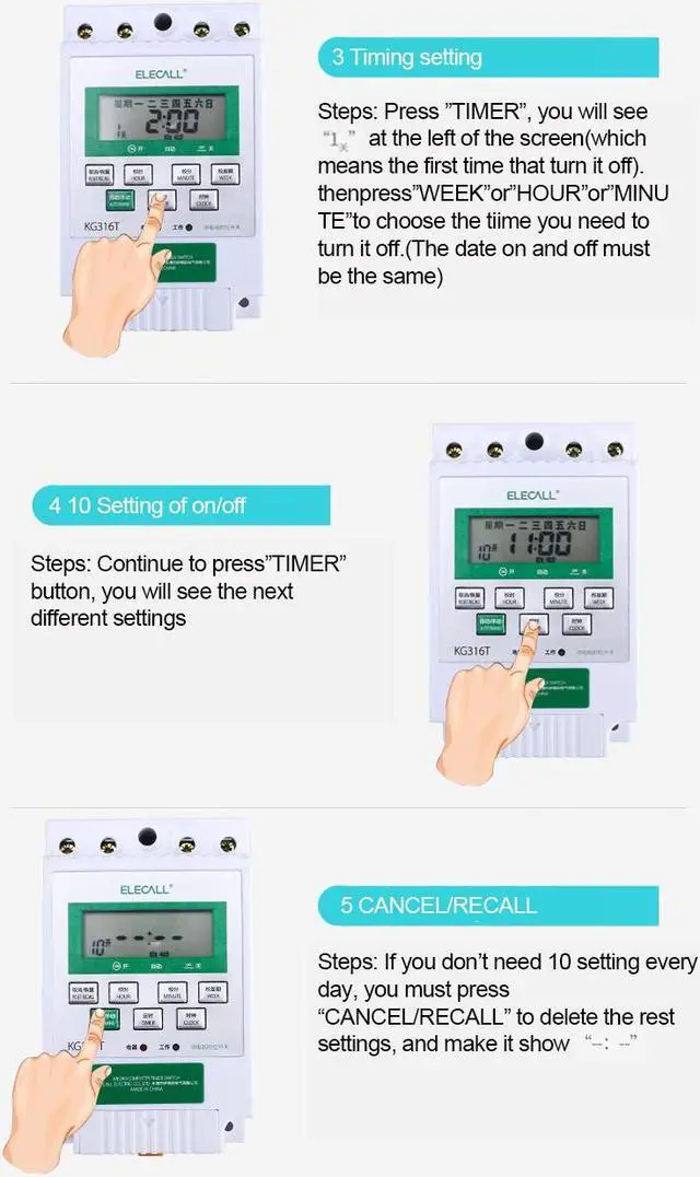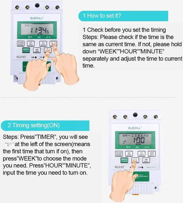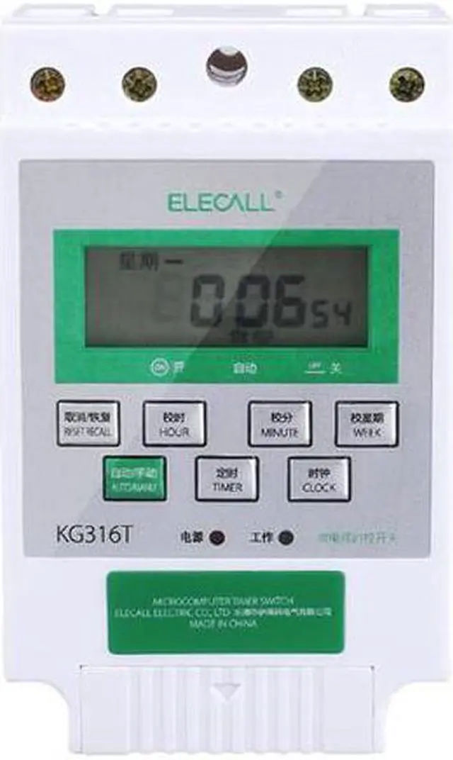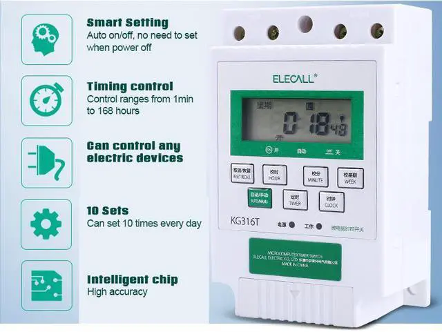 ELECALL Kg316t Microcomputer Control Switch Lights Controller 220v Power Timer Automatic Timer Switch Standard power supply:220V/50HZPower supply range: 170V-240VConsumption power:<4VATiming control range:1min-168hours10 sets timing every day: Auto or by handTiming Tolerance:<2s/dayEnvironment temperature:-10~50Relative humidity:<95%Dimensions:120*74*50mm