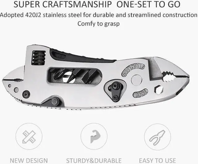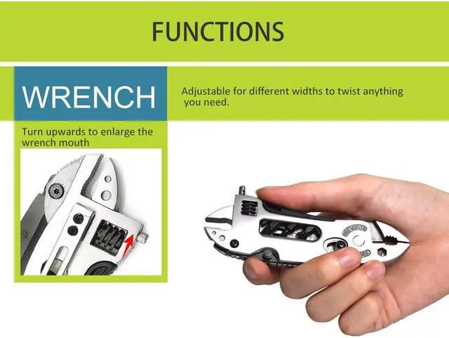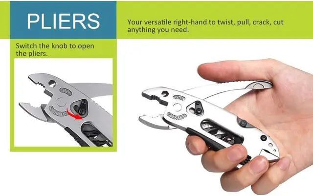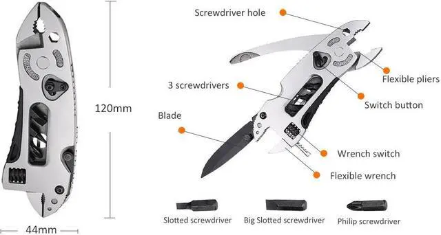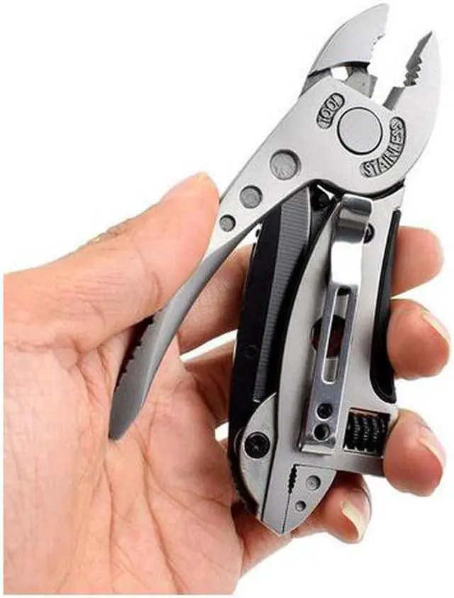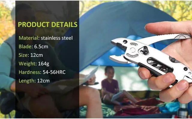 Function 1. pliers 2 .adjustable wrench 3. main knife 4 .screwdriver Material: Stainless steel The main knife: 6.5CM Size: 12CM Weight: about 164G Hardness: 54-56hrc Full length: 12CM The main blade length 6.5cm Folding length of 12cm Expand the length of 17.3cm Folding specifications 12 * 4 * 1.3com Hardness 54-56 Wrench open about 12mm Pliers open about 23mm