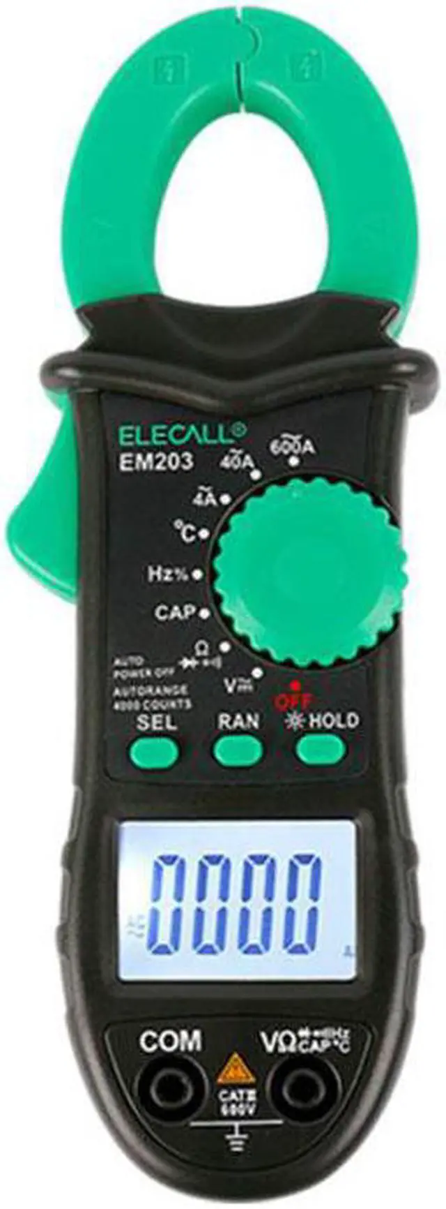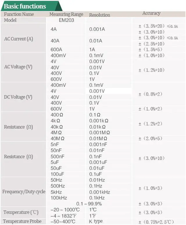 Specifications:Model: EM203 AC Current (A): 4A (3.0%+10) ;40A(2.5%+10) ;600 A (1.5%+5) ;AC Voltage (V): 400mV(1.0%+10); 4V/40V/400V/600 V (1.2%+10); DC Voltage (V): 400mV/4V/40V/400V(0.8%+2); 600 V (1.0%+2); Resistance (): 400/4K/40K/4M (1.2%+2); 40 M (2.0%+5); Capacitance (F): 5 nF/50 nF/500 nF/5uF/50 uF/100 uF (3%+10) ; Frequency (Hz): 50 Hz/500 Hz/5kHz/100 kHzz (1.0%+3);General Characteristics: Power: AAA Batteries*2pcs LCD Size: 36 * 24mm Product Color: Green and GrayProduct Net Weight: 283g Package Weight: 300g 1.EM203 is a 4000-count AC/DC digital clamp meter with stable performance.2. AC/DC voltage and AC current,resistance,capacitance,diode,continuity buzzer,frequency,temperature measurment.3.Note:This meter is not a True-RMS meter and use indoor ,please know that before you place your order.Features:Display Count: 3999 Jaw Capacity: 28mm Diode: Data Hold: LCD Backlight: Auto Power Off: Continuity Buzzer: Low Battery Indication: