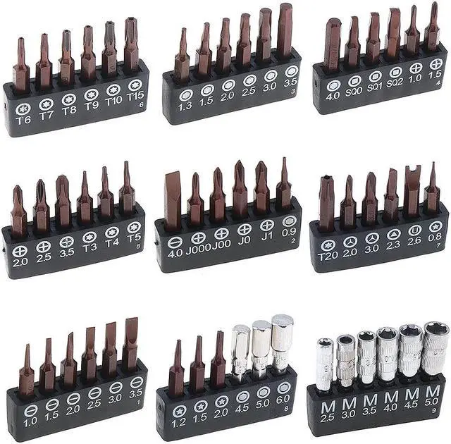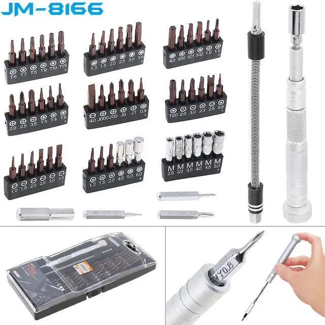 JM-8166 61pcs/set Multi-function S2 Screwdriver Kits with Universal Soft Rod and Aluminum Alloy Handle for Tablet PC / Mobile Phone Repair Features: - 61 in 1 high-end precision screwdriver, including adjustable aluminum handle and multi-angled soft rod - Complete cell phone repair tools include many different types of screwdrivers - This product is a combination product and it is easy to operate and durable. It can be directly positioned without turning the screw. - The item can use to repair main board and chip in different size - With removable chief spindle which can be moved to the position you want - Make for ABS and stainless steel, durable and smoothMaterial: S2, aluminum alloyStandard: MetricBrand Name: JakemyModel Number: JM-8166Function: CombinationApplication: Precision instrumentRotary Head Type: Hexagon, Y-type, Phillips, Torx, Flathead, Star, Square,Triangle, U-type Magnetic: Yes61 in 1 screwdriver kit include: - 6 pcs Sleeve: 2.5, 3, 3.5, 4, 4.5, 5.5mm - 6 pcs CRV Precision Screwdriver Bit - 9 pcs S2 Phillips Bit: 1.0, 1.5, 2.0, 2.5, 3.5, J000, J00, J0, J1 - 8 pcs S2 Hexagon Bit: 0.9, 1.3, 1.5, 2.0, 2.5, 3.0, 3.5, 4.0 - 10 pcs S2 Torx Bit: T3, T4, T5, T6, T7, T8, T9, T10, T15, T20 - 7 pcs S2 Flathead Bit: 1.0, 1.5, 2.0, 2.5, 3.0, 3.5, 4.0 - 4 pcs S2 Star Bit: 0.8, 1.2, 1.5, 2.0 - 3 pcs S2 Square Bit: SQ0, SQ1, SQ2 - 2 pcs S2 Y-type Bit: 2.0, 3.0 - 1 pcs S2 Triangle Bit: 2.3 - 1 pcs S2 U-type bit: U2.6 - 1 pcs Adjustable length aluminum alloy Driver Adapter - 2 pcs Flexible Extension Rod - 1 pcs Multi-angled Soft Rod Product Weight : 385 G / 13.58 Ounces Product Dimensions (L*W*H) : 205*95*25 MM / 8.07*3.74*0.98 Inches Package Weight : 385 G / 13.58 Ounces Package Dimensions (L*W*H) : 205*95*25 MM / 8.07*3.74*0.98 Inches Retail Packaging: Yes, General Box
