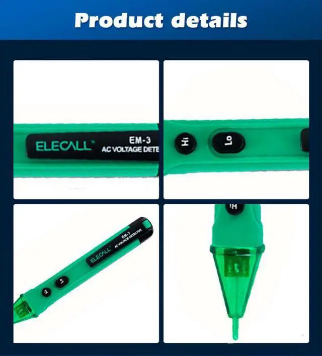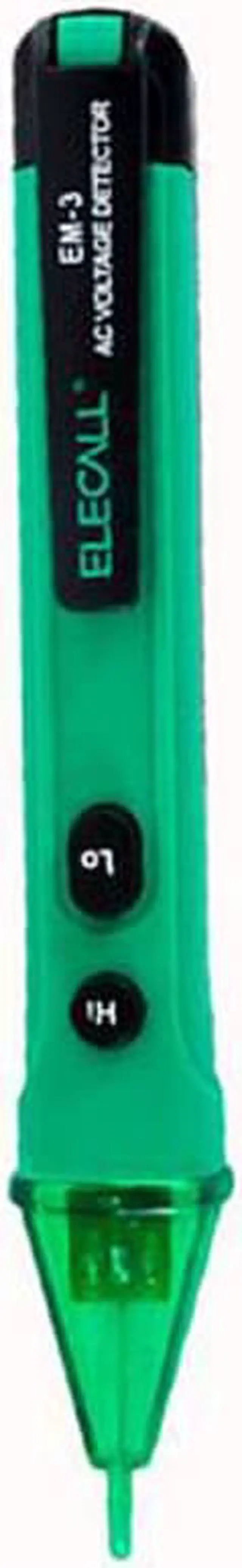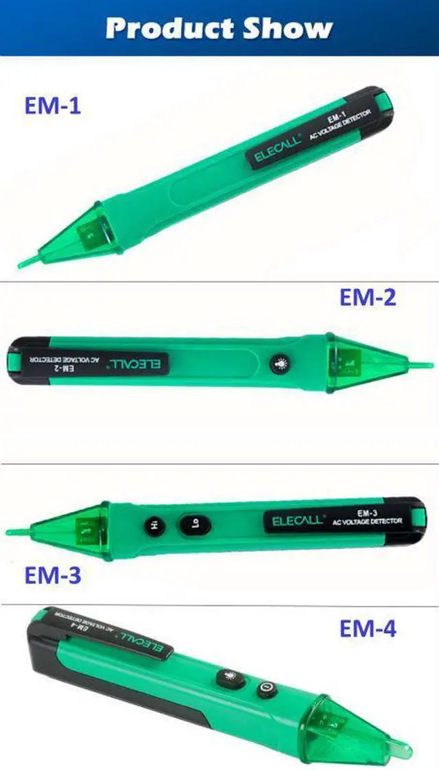 Brand ELECALL Name Non touch Voltage test pencil Model EM-3 Voltage test range 12-1000ACV(50-500Hz) International Safe Standard EN61010-1/600VCAT III Work Temperature -10-50C Storage Temprature -20-60Degree Humidity <8s%RH Battery 2*1.5v(AAA Type) Size 146*25*22mm Weight 26g Non-contact test pen, safe, convenient to use. Pen clip design, portable for use. Wide AC voltage range: 12-1000V With High accuracy resistance inside Translucent pencil head with LED The red light will be flash and the item will alarm when detect the electric Press 12-22 times can test Live Wire and Netual wire