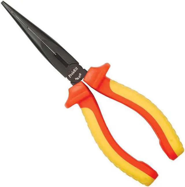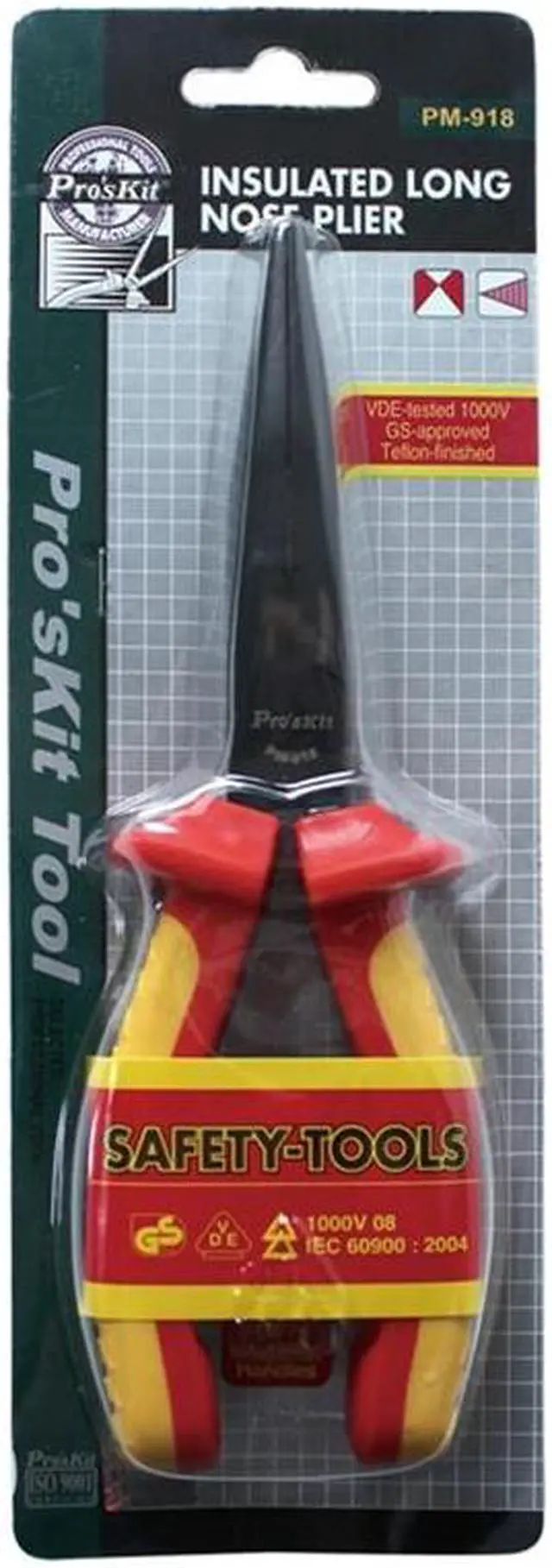 Pro'sKit PM-918 1000V Insulated Long Nose Plier(200mm) Wire Cable Cutter Hand Tools Pro'sKit VDE approved pliers with induction hardened cutting edges in a Teflon polished finish. Supplied with soft grip handles for comfort and control. Cutting capacities according to IEC 900, and DIN 1000V safety standards and bear the GS sign.Features: Certified to IEC 60900: 2004, VDE, and DIN 1000V safety standards and bear the GS sign. High visibility molded ergonomic cushion grip handles for maximum comfort. Teflon multi-layered hard chrome finished. Drop forged from special tool steel.