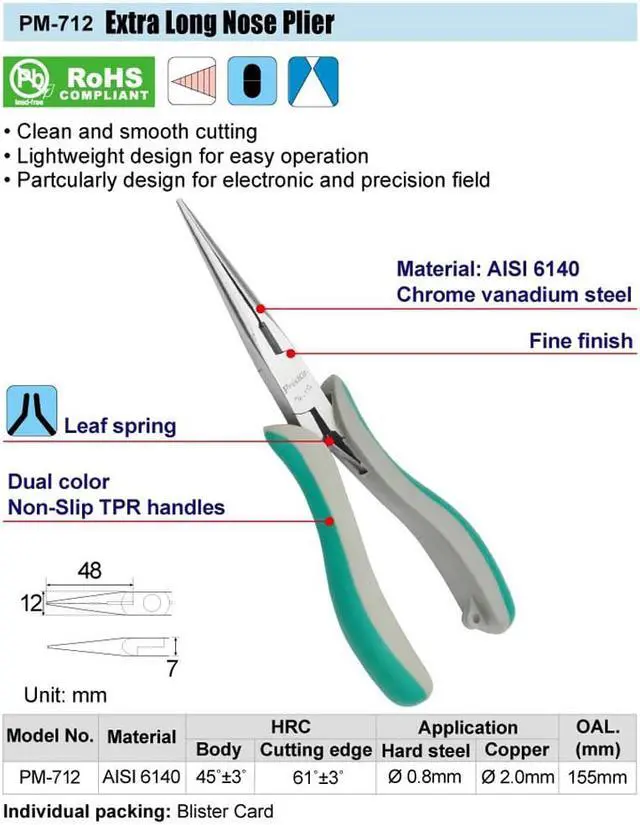 Pro'sKit PM-712 Electronic And Precision Extra Long Nose Plier (155mm) Cable Cutter Pliers Hand Tools Clean and smooth cutting Lightweight design for easy operation Particularly design for electronic and precision field