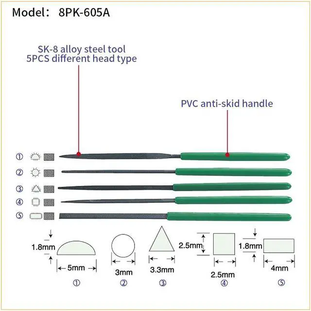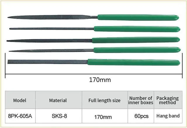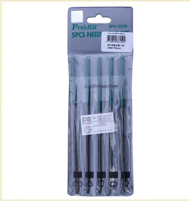 Model: 8PK-605A Material: SKS-8 Length: 170mm Number of inner boxes: 60pcs Packing: straps SK-8 alloy tool steel, super hard wear Handle the PVC drape, grip better 5 different head type, suitable for precision operations Length: 170mm Working length: 75mm Handle diameter: 5mm