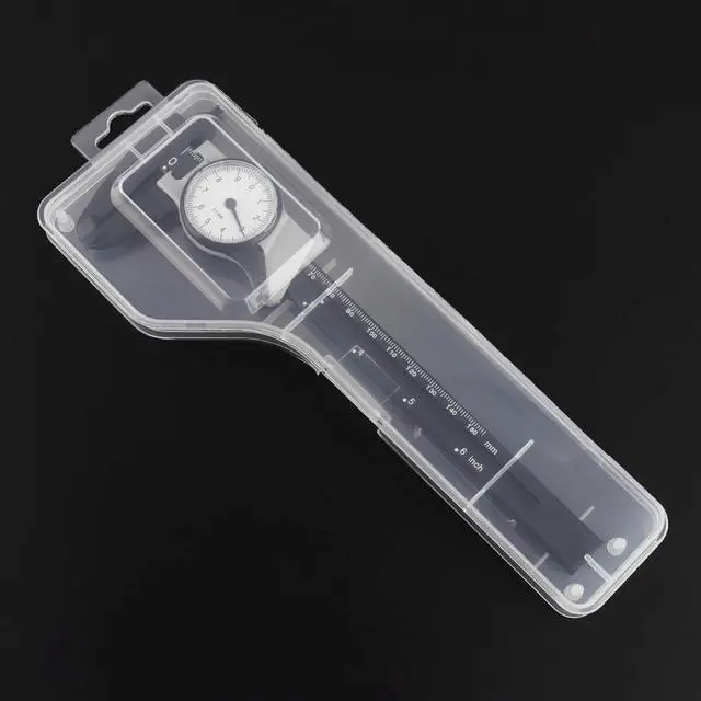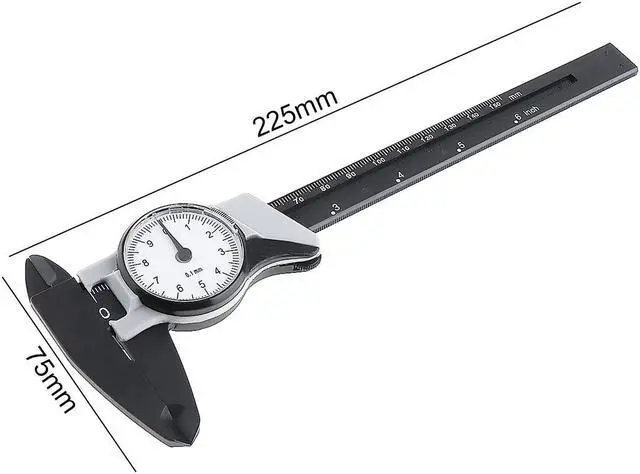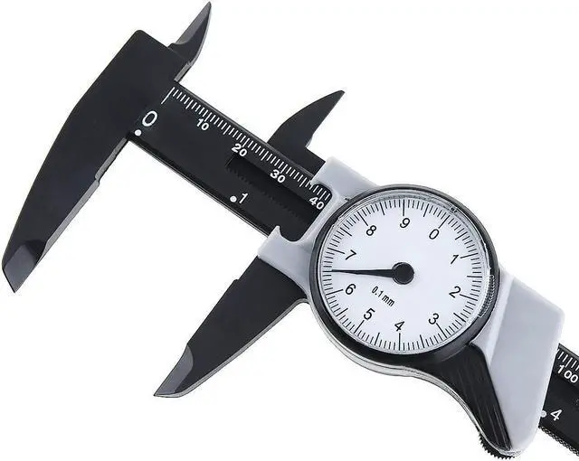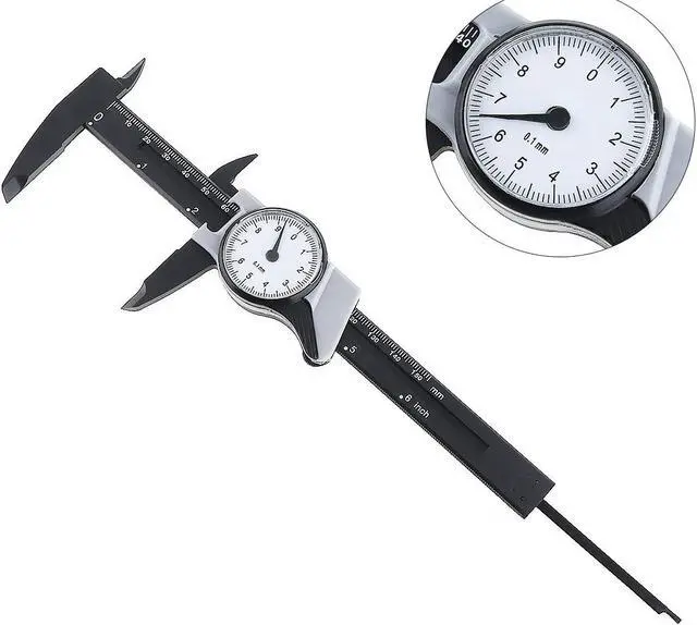 Material: PlasticRange: 150mm 6inchReading: 0.1mmColor: White and BlackSize: 225mm Product Weight : 43 G / 1.52 Ounces Product Dimensions (L*W*H) : 225*75*15 MM / 8.86*2.95*0.59 Inches Package Weight : 43 G / 1.52 Ounces Package Dimensions (L*W*H) : 225*75*15 MM / 8.86*2.95*0.59 Inches Retail Packaging: Yes, General Box Features: - Makes inside, outside, depth, and step measurements up to 150 mm. - The metric dial is graduated to the nearest 0.1 mm. - Made of lightweight Non-marring carbon fiber material. Can be used in laboratory, medical office, wood shop, farm, school, and DIY at home. Free of hurting when measuring. It is suited for measuring jewelry, magnectic objects and charged objects.