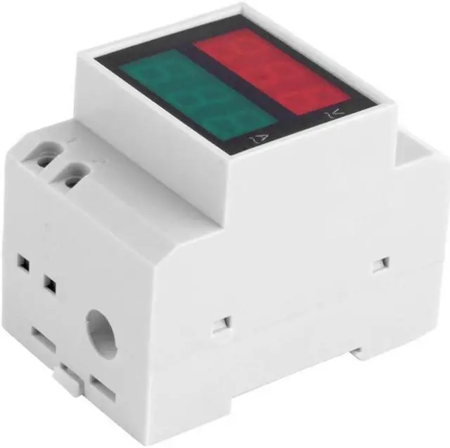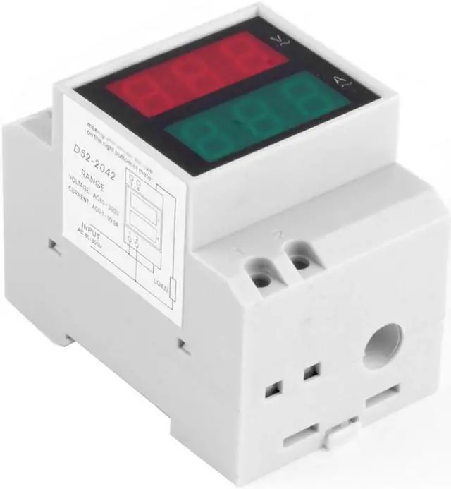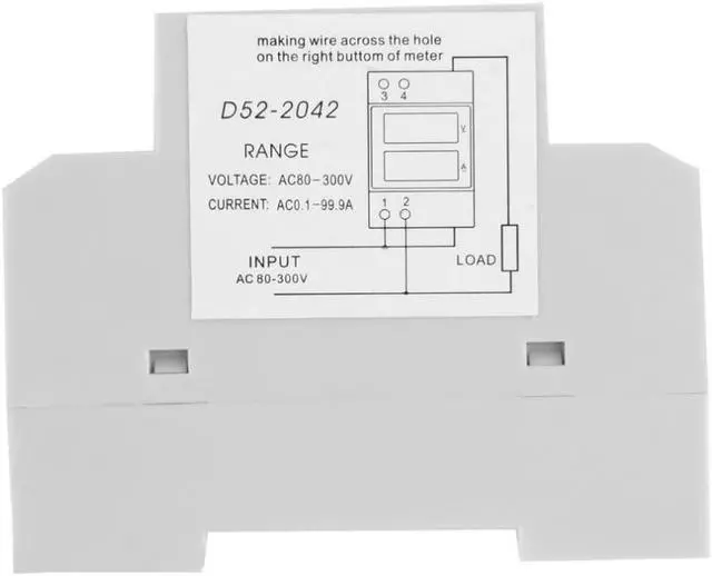 Accuracy: 1% Display: 0.5-inch LED digital tube Measuring voltage: AC 80V-300V Measuring current:AC 0.1-99.9A Power consumption <0.2VA Measurement speed: about 2 times per second Shell Material: Plastic Size: approx. 80 x 53 x 60(mm) Net Weight: 119g 100% Brand new and high quality! D52-2042 Din-rail AC voltage and current meter can display AC voltage and current at the same time. If the measuring current is lower than 99.9A, you can get the AC current only making the wire accross the hole which in the right side of the meter. If the measuring current is higher than 99.9A, you should connect meter with a current transformer. Good stability and high measurement accuracy Appearance in a standard size, easy to install Power supply polarity protection circuit