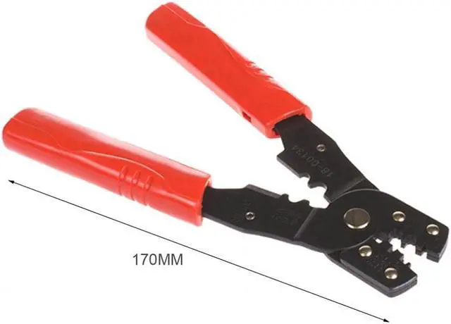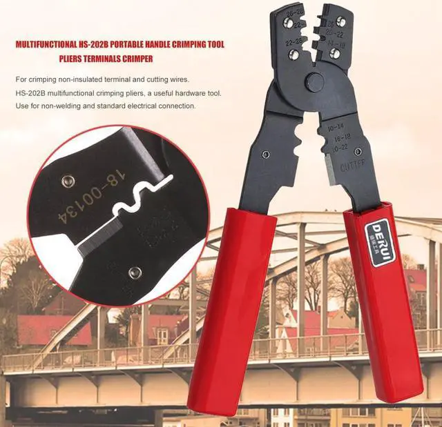 Material: High-carbon Steel Handle material: PC plastic Length: 170mm Color: Black & red Function: Disconnection, Crimp Shape: Flat Suitable object: Cable, Terminal Ergonomic handle design, enhanced gripping strength. HS-202B multifunctional crimping pliers, a useful hardware tool. Use for non-welding and standard electrical connection. For crimping non-insulated terminal and cutting wires. High efficiency, good reliability and lifelong lasting time, is useful and durable.