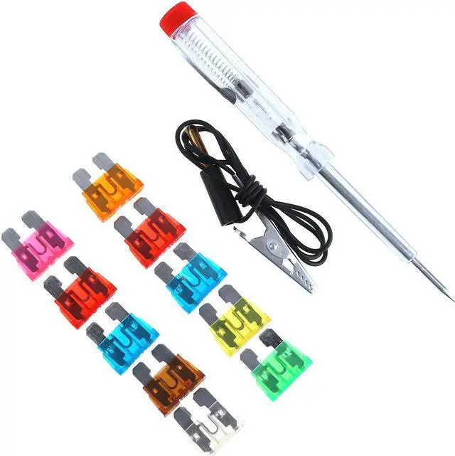 Note: - Do not use beyond the test range. - No spare warranty light bulbs. - This product is used in test circuit: do not connect with the circuit for long time Package Weight : 45 G / 1.59 Ounces Package Dimensions (L*W*H) : 205*110*20 MM / 8.07*4.33*0.79 Inches Retail Packaging: Yes, Blister Packaging Features: - Lightweight, pointed design, compact structure, easy to carry.. - Handle is made of AS plastic and the hardened & tempered carbon steel probe is chrome plated. - The sharp steel probe easily pierces wire insulation to check circuitry. - Light in handle glows when circuit connection is complete. - DC test: 6V to 24V, can be used to test the resistance, looking for short-circuit wires, test the power outlet. - Rugged, fast, battery-less operation, convenient and economical. - Designed for the detection of low-voltage circuit transport machinery failure designed to be used in vehicles, motorcycles, bulldozers, rollers and other transport machinery maintenance operations. Material: AS Plastic, Carbon Steel Handle Color: See Picture Name: Car Test Pencil Function: Range Type: Contact Voltage Measuring Instrument Voltage Range: 6-24 Quantity: 1pc 10pcs Insurance Chip: - 1 x 3A - 1 x 5A - 1 x 7.5A - 2 x 10A - 2 x 15A - 1 x 20A - 1 x 25A - 1 x 30A