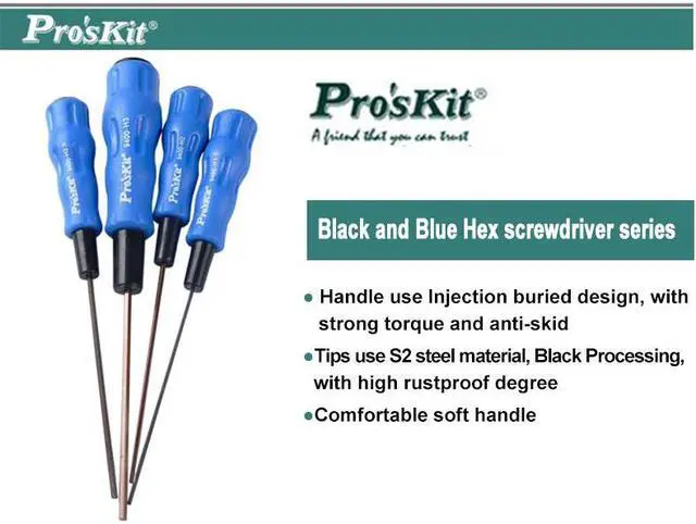Model A B C D E Packing Wieght 89400-H1.5 90 1.5 85 1.5 175 Blister card 20g 89400-H2 90 2 85 2.0 175 Blister card 21g 89400-H2.5 90 2.5 85 2.5 175 Blister card 23g 89400-H3 90 3 110 3.0 200 Blister card 44g Black and Blue Hex screwdriver seriesHandle use Injection buried design, with strong torque and anti-skidTips use S2 steel material, Black Processing, with high rustproof degreeComfortable soft handle