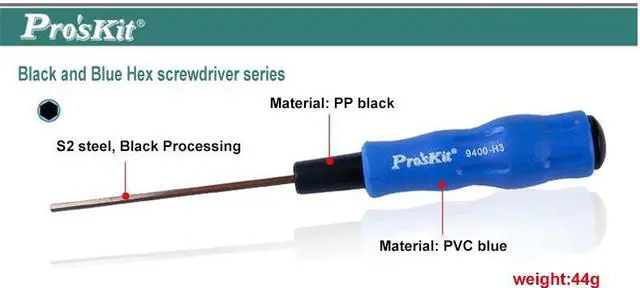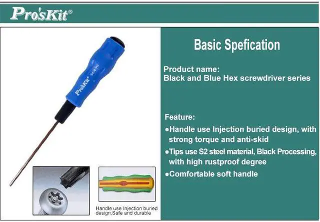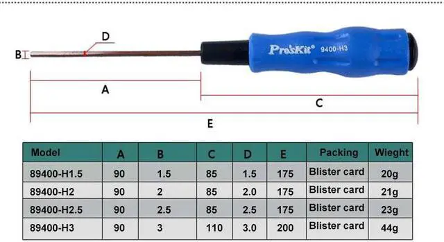 Model A B C D E Packing Wieght 89400-H1.5 90 1.5 85 1.5 175 Blister card 20g 89400-H2 90 2 85 2.0 175 Blister card 21g 89400-H2.5 90 2.5 85 2.5 175 Blister card 23g 89400-H3 90 3 110 3.0 200 Blister card 44g Black and Blue Hex screwdriver seriesHandle use Injection buried design, with strong torque and anti-skidTips use S2 steel material, Black Processing, with high rustproof degreeComfortable soft handle