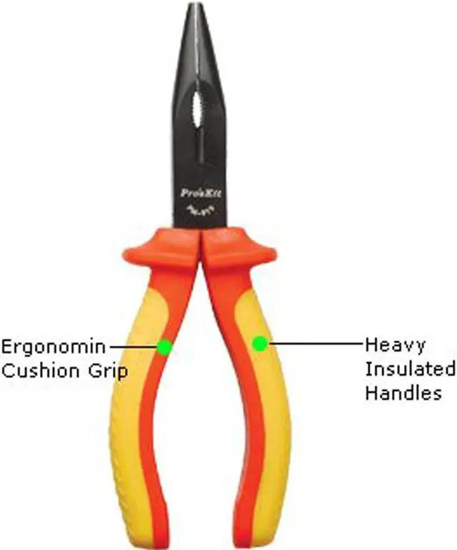 Certified to IEC 60900: 2004, VDE, and DIN 1000V safety standards and bear the GS sign. High visibility molded ergonomic cushion grip handles for maximum comfort. Teflon multi-layered hard chrome finished. Drop forged from special tool steel. Pro'sKit VDE approved pliers with induction hardened cutting edges in a Teflon polished finish. Supplied with soft grip handles for comfort and control. Cutting capacities according to IEC 900, and DIN 1000V safety standards and bear the GS sign.